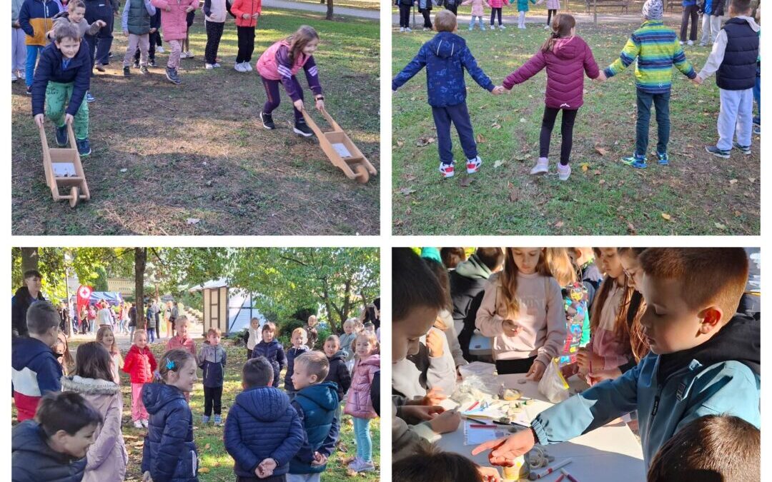 Učenici 1.-ih, 2.-ih i 3.a razreda pridružili su se tradicionalnom javnom okupljanju djece u gradskom parku povodom Dječjeg tjedna te ispunili dan zajedničkom igrom, druženjem, veseljem i stjecanjem novih vještina.