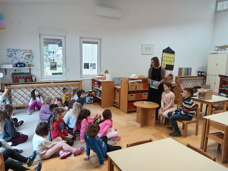 Zara i Karlo čitali su djeci iz skupine „Bojice“ priču „Jan i čarobni grah“ na hrvatskom jeziku. Nakon čitanja uslijedila je igra povezivanja slika i riječi na engleskom jeziku, kako bi djeca usvojila ključne pojmove iz priče prije slušanja i čitanja priče na engleskom jeziku. Uz to, djeca su pogledala i kratki videozapis priče „Jack and the Beanstalk“ na engleskom jeziku. Čitanje je završilo zanimljivom raspravom o čarobnim predmetima koje bi djeca voljela imati kod kuće.